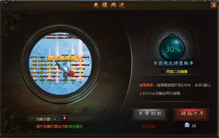 系统说明:开启爽爆两次功能,BOSS被击杀时可以触发1次额外掉落,提升国家圣器等级可以增加触发次数。只要运气够好,1次击杀甚至掉落2件极品装备。