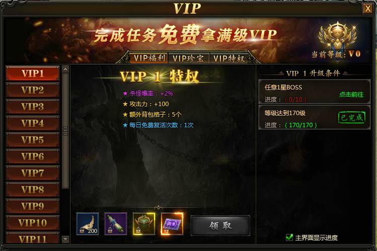系统说明:VIP系统是游戏的特色系统之一,VIP升级全免费,完成VIP任务即可提升VIP等级,提升VIP等级可获得VIP特权,领取VIP奖励,开启VIP珍宝。