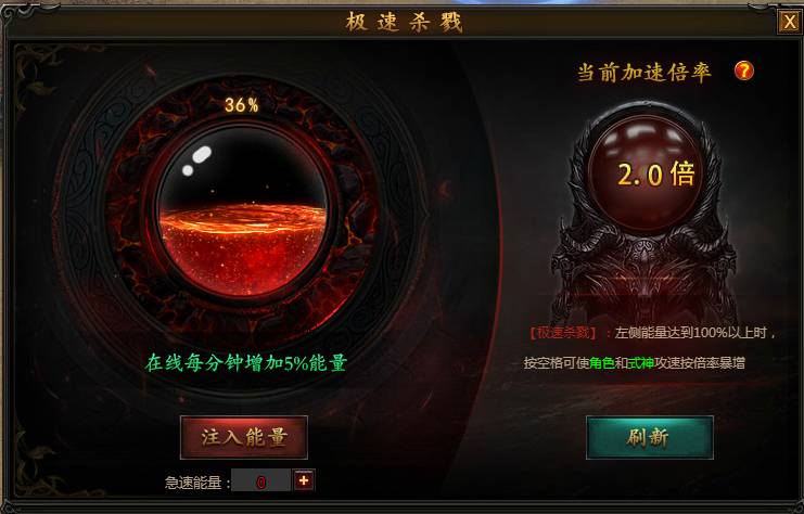 系统说明:极速能量满后,空格键即可开启极速杀戮模式,角色和式神攻速按倍率暴增,最高10倍速攻击,体验开挂一般的感觉。
