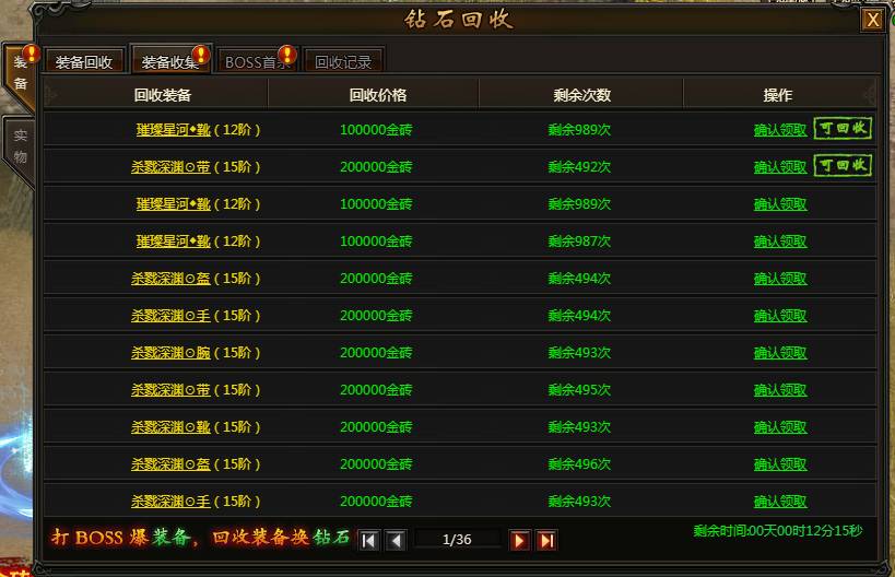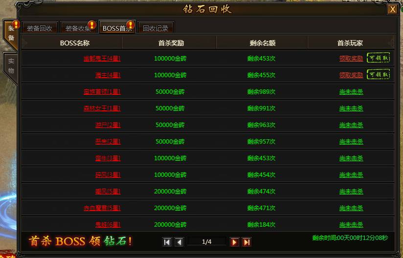 系统说明:玩家获得装备或者完成BOSS首杀,可以领取金砖/钻石,名额有限,拼的就是手速。