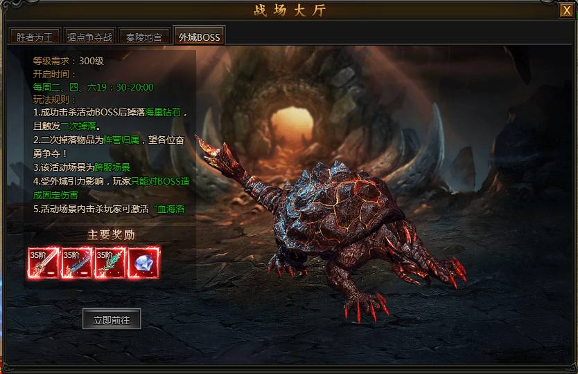 系统说明:定时活动,击杀BOSS掉落满屏钻石,极品红装,全国齐心协力,与跨服敌对阵营争夺外域BOSS掉落