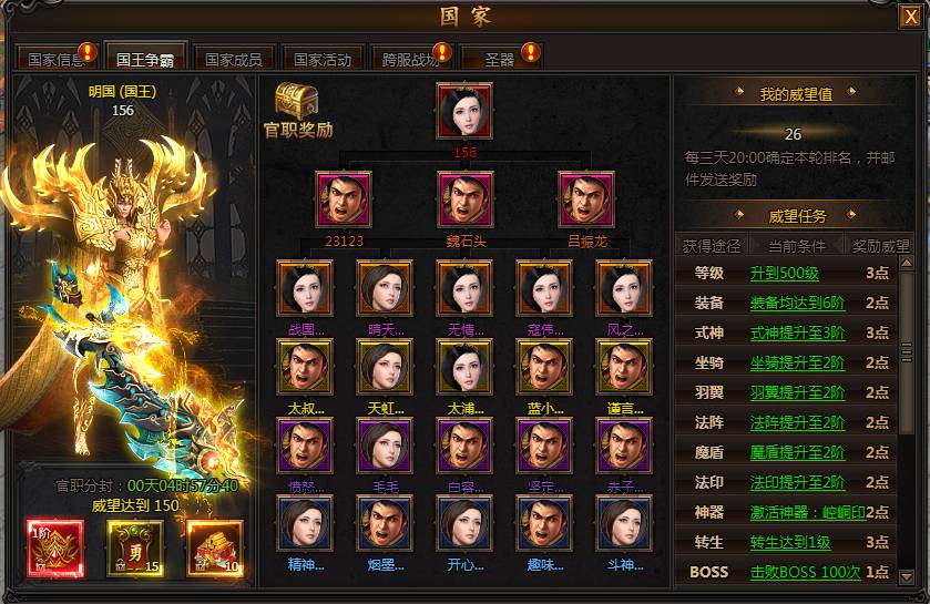 国王和官职由威望排名产生,玩家通过完成威望任务可以获得威望值,争夺国王或者官职,获得更多特权。