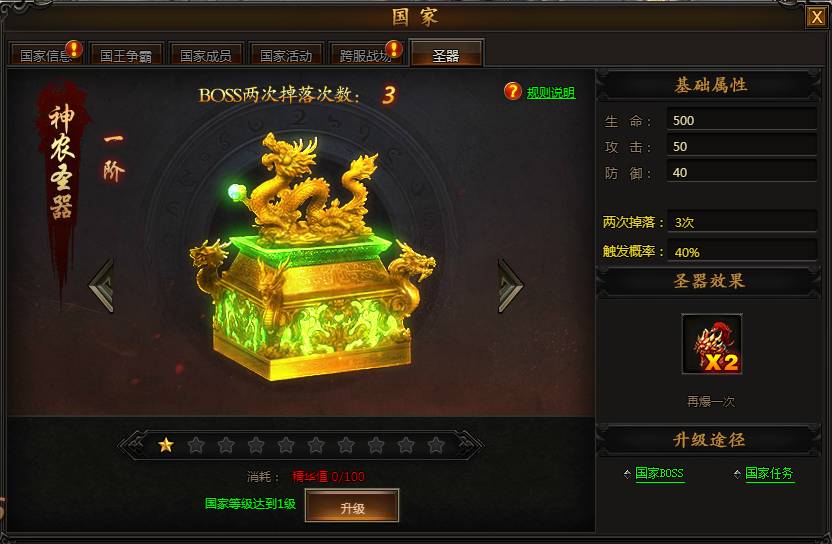 国家圣器可以让BOSS被击杀时再爆一次掉落。通过完成国家任务,国家BOSS活动,提升国家等级可以提升国家圣器等级,获得更多再爆一次掉落