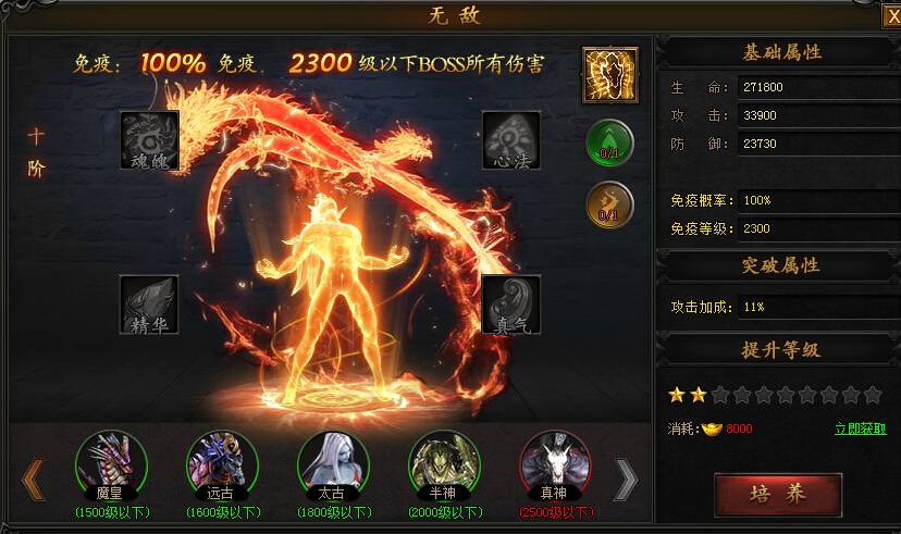 无敌系统升级需要花费元宝,每阶需要玩家花费元宝升10颗星,谭厚完成指定击杀任务,才可以进行突破到下一阶。玩家租赁无敌契约可以使免疫boss等级上限+500级。